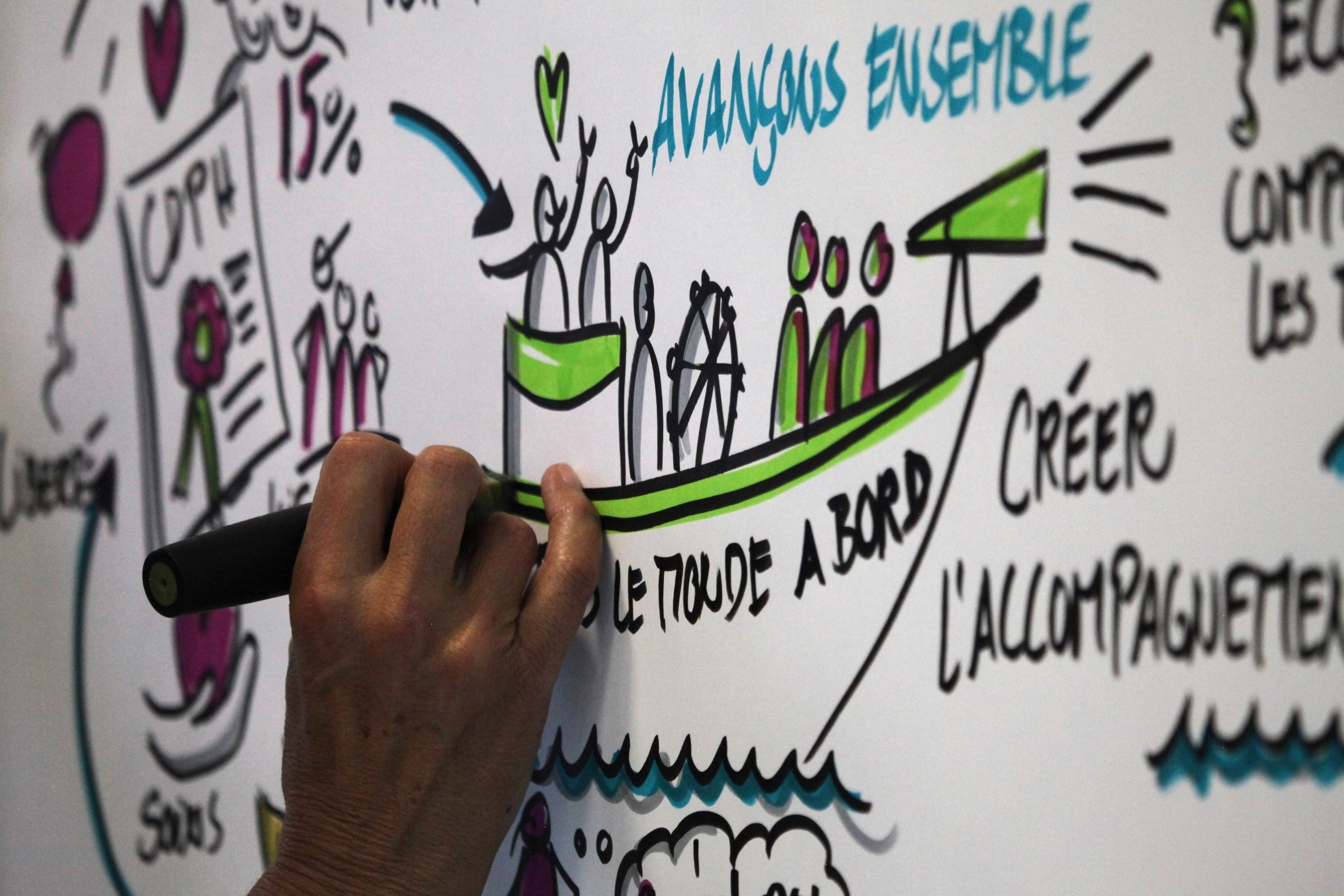 Le graphic recording s’applique à de nombreux contextes : réunions d’entreprise, ateliers pédagogiques, séances de co-création ou de brainstorming. Il peut être réalisé sur de grands supports papier, des tableaux blancs ou en version numérique, sur tablette.